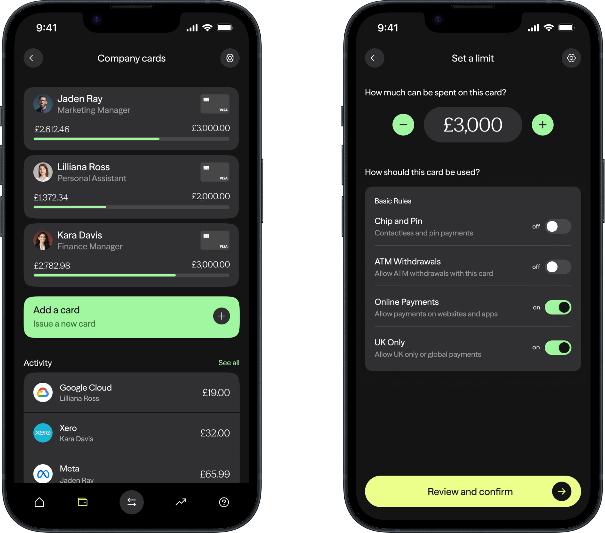 The app also lets users define and assign roles to team members or individuals, each with custom access levels and permissions. Users can create virtual cards, set spending limits, and control usage permissions—all through a centralized interface that offers a clear overview of roles, users, cards, and activities.