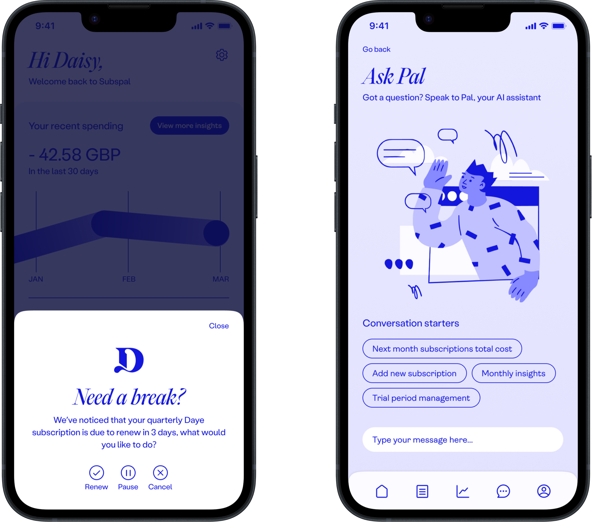 Before subscriptions renew, the app checks in with users to confirm whether they’d like to continue their ongoing subscriptions. Subspal’s AI assistant, Pal, can also quickly answer questions and even provide instant calculations of the user’s projected subscription spend for the upcoming month.